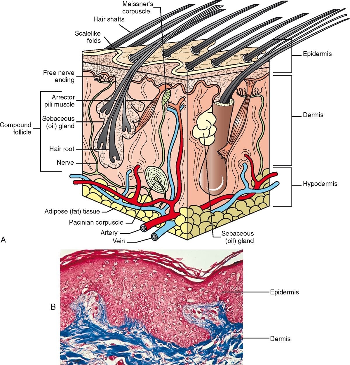 The deep, connective tissue portion of the skin that contains blood vessels, glands, and hair follicles.