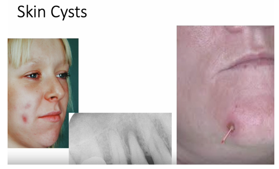Appears as a skin lesion at mandibular border. A sinus tract connects lesion → tooth apex. GP point + radiograph can confirm source.