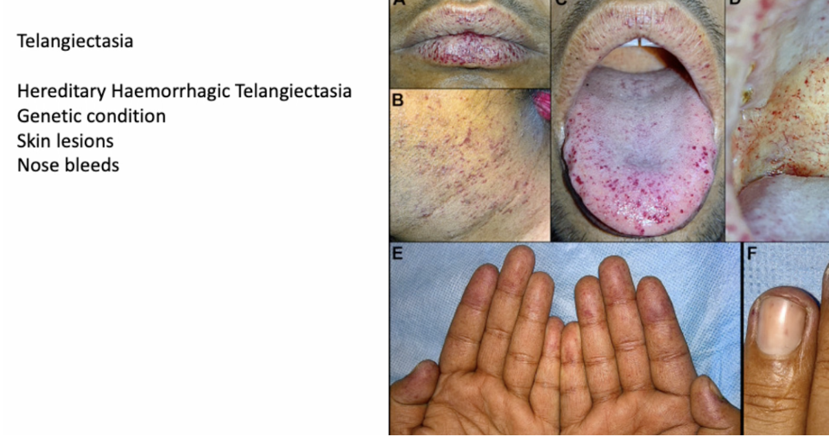 Dilated small vessels. Hereditary haemorrhagic telangiectasia = genetic condition → skin lesions, recurrent epistaxis.
