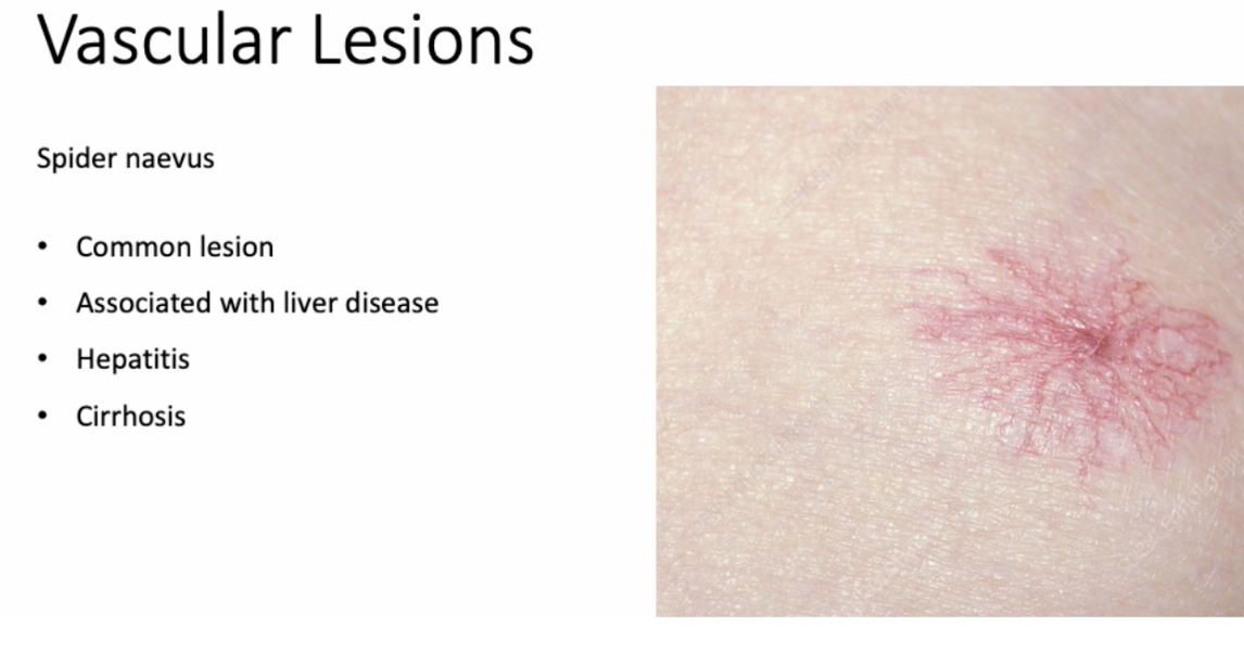 Central red papule with radiating vessels. Associated with liver disease (cirrhosis, hepatitis).