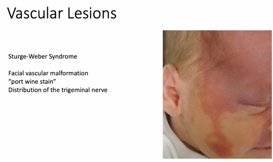 Congenital condition → port wine stain (vascular malformation) in trigeminal distribution + leptomeningeal vascular malformations → epilepsy risk.