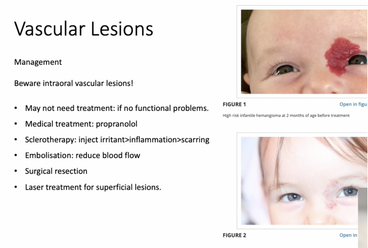 Medical: propranolol. Sclerotherapy (irritant injection → fibrosis). Embolisation (reduce blood flow). Surgical resection. Laser therapy (superficial lesions).