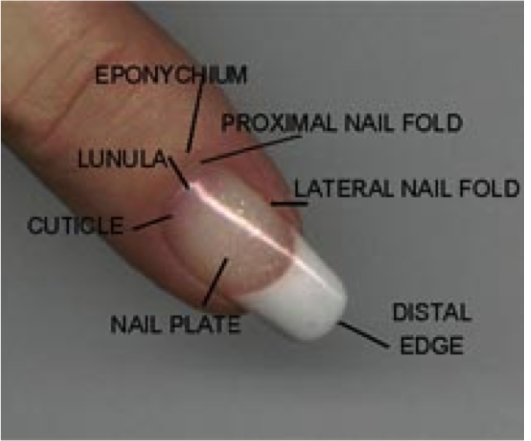 be able to identify the following: Lunula (whitish moon), proximal nail fold, cuticle, lateral nail fold.