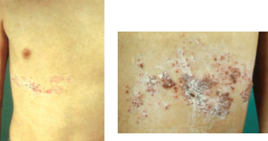 A patient with a history of herpes zoster presents with a dermatomal, unilateral rash which consists of eruptions of papules, vesicles and crusts