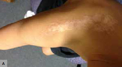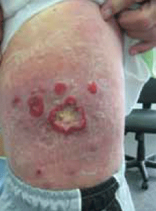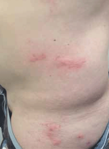 He stated that the rash started with crops of raised, itchy, nonscaly reddybrown lesions, which would ulcerate and then regress over a 6 week period.
