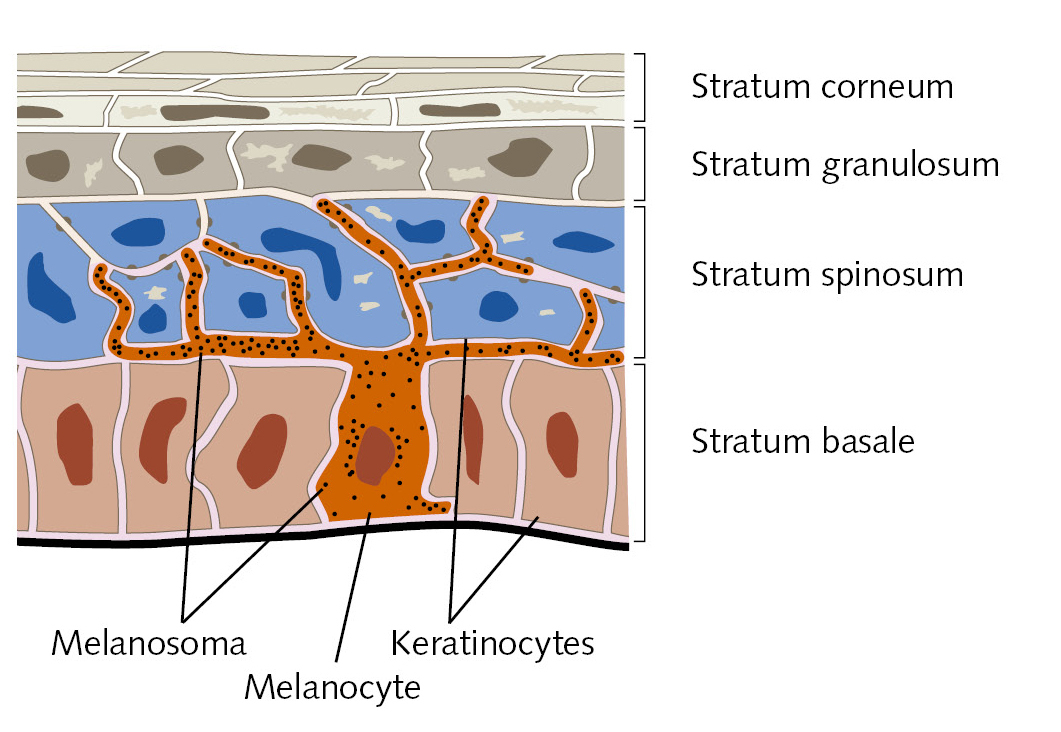 Melanocytes (dendritic cells) sit above basal layer, transfer melanin pigment granules to keratinocytes through projection (epidermal melanin unit). Melanin granules spread around for pigmentation and UV protection