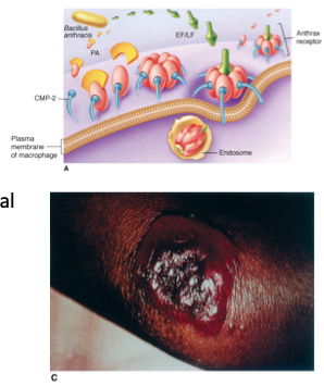 * Pathogen category: G+ rods, aerobic, extracellular * Source: herbivores and their skin products * Virulence: endospore formation; capsule; exotoxin * Clinical: cutaneous anthrax form spores; respiratory anthrax if spores inhaled; eschar surrounded by edema * Immune response: Igs to opsonize the capsule * Treatment/Prevention: ciprofloxacin; alternative doxycycline; vaccine for military