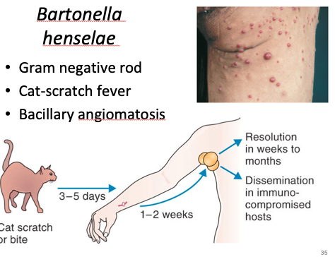 * Pathogen category: G- rods, aerobic, intracellular * Source: zoonotic transmission from cat scratches or bites * Virulence: endotoxin * Clinical: cat scratch fever; bacillary angiomatosis (invade endothelial cells and trigger proliferation of blood vessels) in ICP * Immune response: cell mediated with CTLs * Treatment/Prevention: erythromycin or doxycycline; azithromycin alternative * Triggers localized lymphadenopathy (response in lymph nodes)