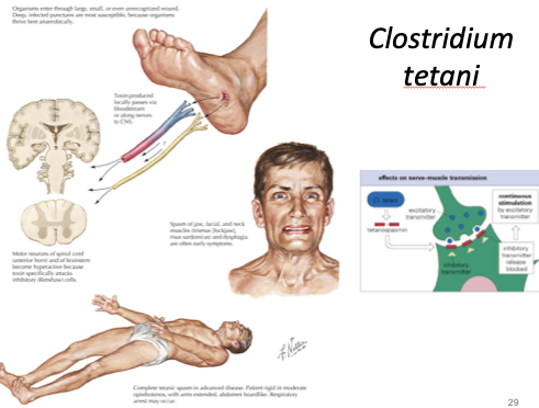 * Pathogen category: G+ rod, tennis racquet shaped, obligate anaerobe, extracellular * Source: soil * Virulence: endospore formation, tetanus toxin that inhibits glycine and GABA * Clinical: tetanus with spastic paralysis (blocks NT) * Immune response: antibodies to toxin * Treatment/Prevention: antitoxin, wound debridement, metronidazole, TDaP (toxoid vaccine); penicillin, doxycycline