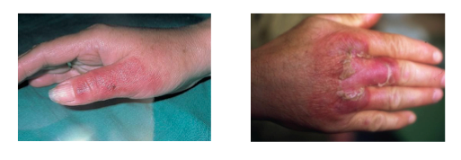 Erysipelothrixrhusiopathiaeis an aerobic G+ rod that can present from animal (farm animals, fish) exposure from handling with abraded skin. This generates a painful subacute cellulitis with not much swelling and a distinctive purplish tone.
