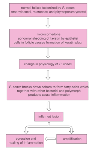 Propionibacterium acnesis an anaerobic Gram positive rod that is part of the normal flora, that under certain (hormonal) conditions, where androgens and sebum production are increased, can lead to a folliculitis. Thelipasethat is part of P. acnescan be triggered to create an inflammation from the sebum associated with the hair follicle, i.e., acne vulgaris.Open comedones, where the melanin in sebum can oxidize, are blackheads, in contrast to closed comedones, or whiteheads. Breaking down fatty acids, proliferation of bacteria itself develop inflamed pathogen and acne pathway.