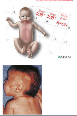 * Pathogen category: enveloped ds linear DNA virus * Source: human reservoir * Virulence: infectivity through respiration * Clinical: roseola (high temp-convulsion, rash, lack of resp findings) * Immune response: cell mediated for clearance * Treatment/Prevention: symptomatic treatment (short lived) * Replicates in WBC and salivary cells * Fever from infection of CD4 cells and trigger cytokines (TNF and IL-1) * Latent in bone marrow cells