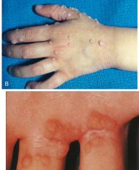 * Pathogen category: enveloped ds linear DNA * Source: human reservoir * Virulence: infectivity through contact (sexual contact in adults); inclusion bodies of collected viral material * Clinical: mollscum contagiosum (widespread in ICP); wart like tumor (unbilicated) * Immune response: cell mediated for clearance; reinfection can occur * Treatment/Prevention: spontaneous clearance