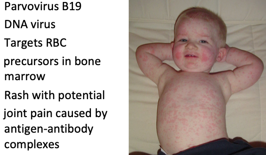 * Pathogen category: unenveloped ss linear DNA * Source: human reservoir * Virulence: infectivity through respiration * Clinical: fifth disease (erythema infectiosum) (antigen-antibody complex formed and infection of erythrocyte precursor cells) * Immune response: cell ediated for clearance * Treatment/Prevention: self-limiting; IgG protection after infection * More impacting if there is a RBC condition (sickle cell, chemo)