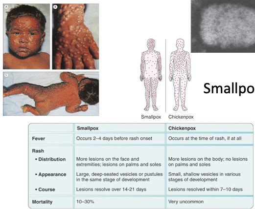 Although officially eliminated in 1977 (there was a lab case in 1978), smallpoxremains as a possible bioterrorismthreat. Following an asymptomatic viremia and a febrile prodromeof fever and malaise, the patient generated a maculopapular rash that becamevesicular, then pustular, before crusting and leaving scars. Mortality was associated with viral cytopathic damage, and hence, necrosis, inflammation, and hemorrhageleading to scarring if more deep seeded than chicken pox.