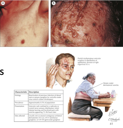 * Pathogen category: enveloped ds linear DNA virus * Source: human reservoir * Virulence: infectivity through aerosol * Clinical: chicken pox (reticuloendothelial system spread, vesicules/pustules), zoster (shingles ( Zoster(shingles): a dermatome-dependent reactivation of the virus, with a vaccine recommended for older adults. In distribution of trigeminal nerve can cause problems into rapidly proliferative epithelial disease), dermatome dependent reactivation) * Immune response: cell mediated for clearance in epidermis, control in sensory neuron * Treatment/Prevention: live vaccine; acyclovir, valacyclovir if needed; varicella-zoster immune globulin (VZIG) as needed for ICP prophylaxis following exposure