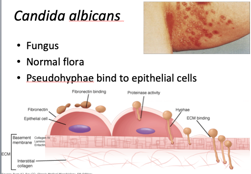 * Pathogen category: yeast * Source: normal skin flora * Virulence: cell wall * Clinical: local infection (thrush, vaginitis) spread with ICP or antibiotic-induced decrease of bacterial flora * Immune response: delayed type hypersensitivity; lost with ICP * Treatment/Prevention: thrush- clotriamzole troche, nystatin suspension; fluconazole for oral therapy; capsofungin if serious systemic illness * Usually in areas of high friction (intertrigo; like armpits)