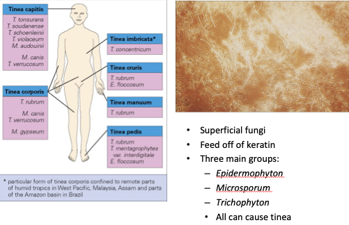 * Pathogen category: mold * Source: nor normal flora; may be from animals, soils, other people, fomites (wet surfaces) * Virulence: keratin focus (keratinase to break down food); requires contact and some skin disruption (maceration) * Clinical: tinea (pedis, corporis, capitis, unguium) * Immune response: delayed type hypersensitivity * Treatment/Prevention: terbinafine cream (tinea corporis); oral terbinafine * Concern of id reaction(generalized pruritic rash) from circulating fungal antigens