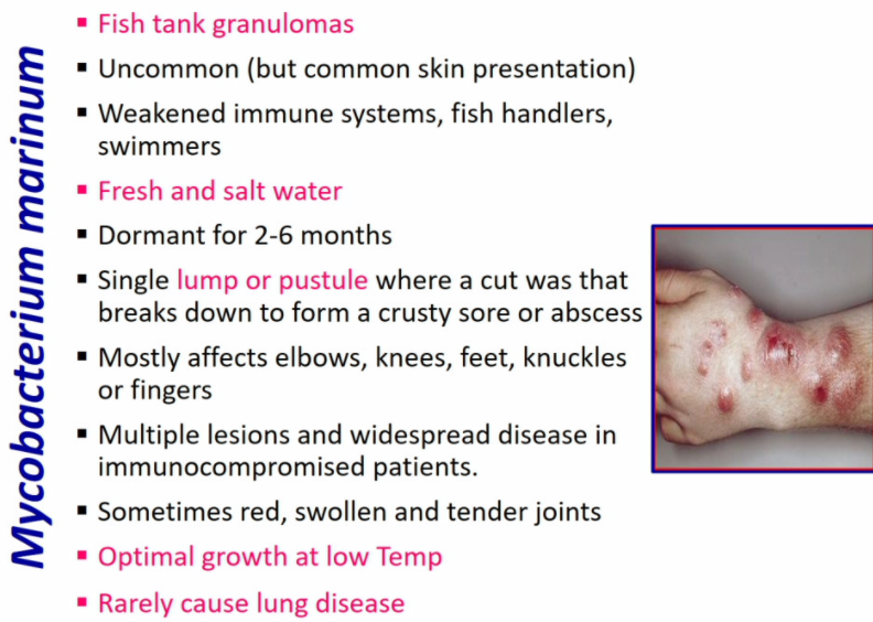 Mycobacterium marinum causes fish tank granulomas and single lump or pustule where a cut was that breaks down to form a crusty sore or abscess