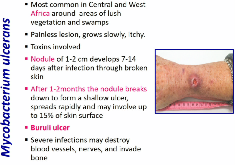 Mycobacterium ulcerans causes Buruli ulcer and is commonly found in Central and West Africa around areas of lush vegetation and swamps