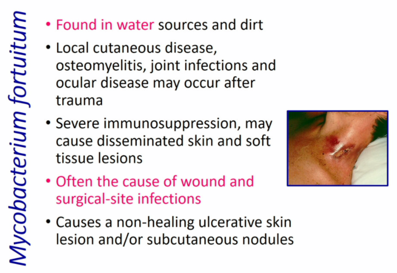 M. fortuitum often infects wounds and surgical-site infections