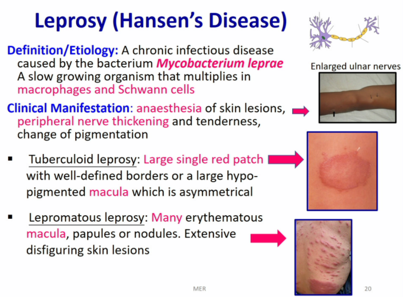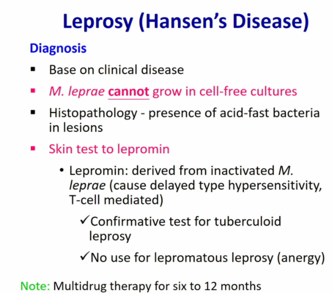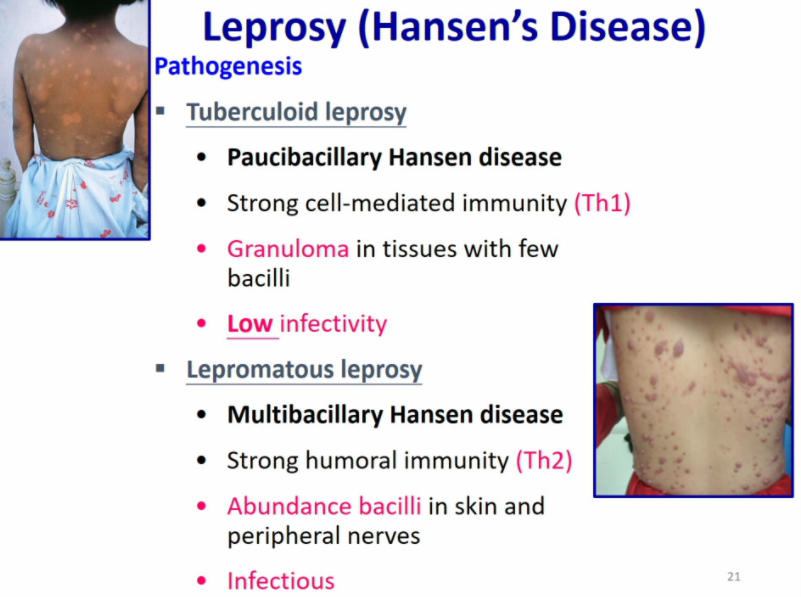 in lepromatous leprosy (aka Multibacillary Hansen disease), there is a strong humoral-mediated immunity, abundant bacilli in skin and peripheral nerves and is infectious