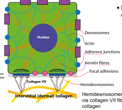 Desmosomes (anchor keratinocytes together and provide intracytoplasmic signalling)