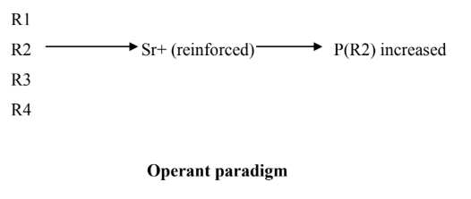 This consists of a discriminant stimulus that signifies the presence or absence of reward, the response, and the reinforcer.