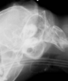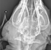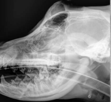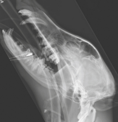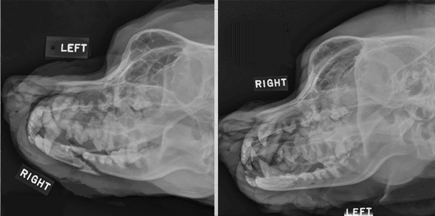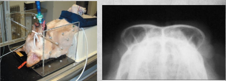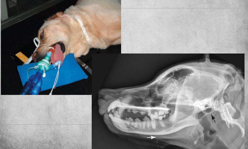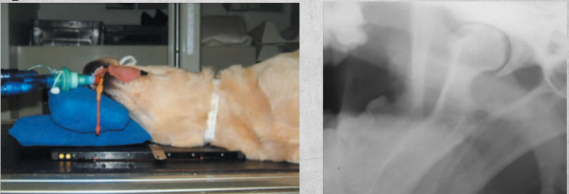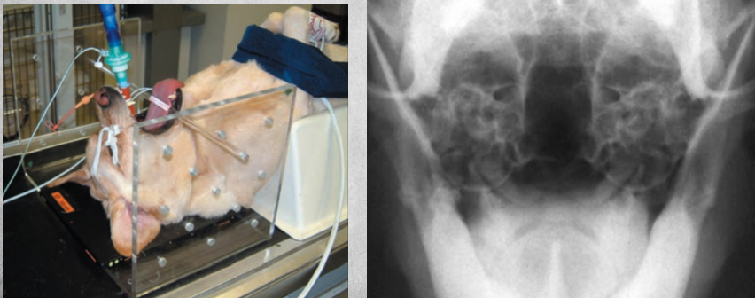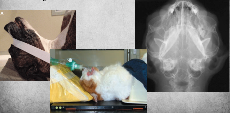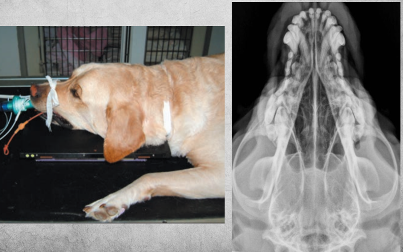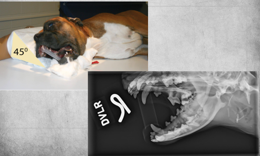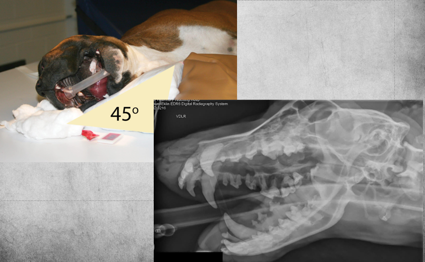 Patient in lateral recumbency, nose lifted 10-30 degrees. Open mouth or closed mouth.