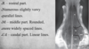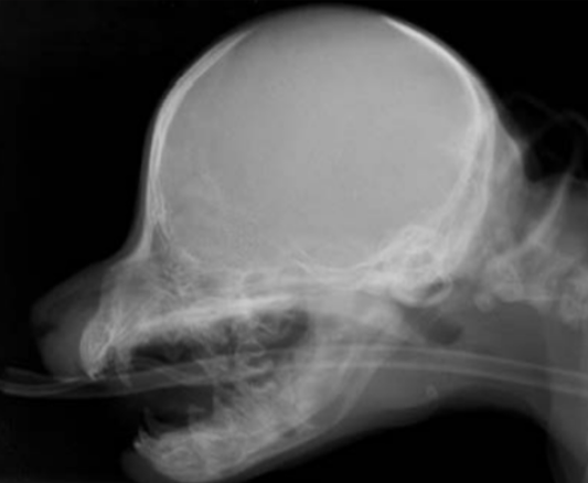 Domed, thin calvarium (in some breeds thickened).