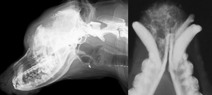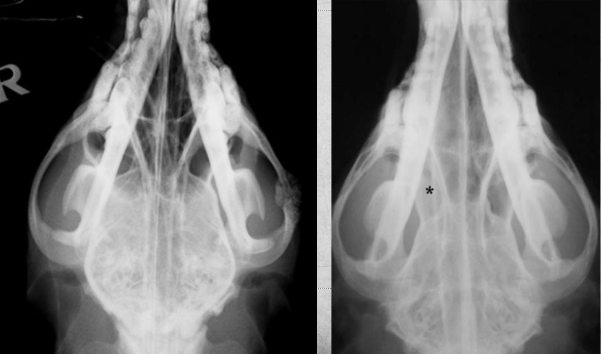 asterisk marks soft tissue neoplasia in left side image. note the difference in density of that space.