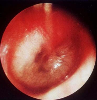 The Eustachian tube becomes blocked, restricting the middle ears ability to equilibrate pressure. Middle ear pressure decreases, causing the tympanic membrane to become retracted.