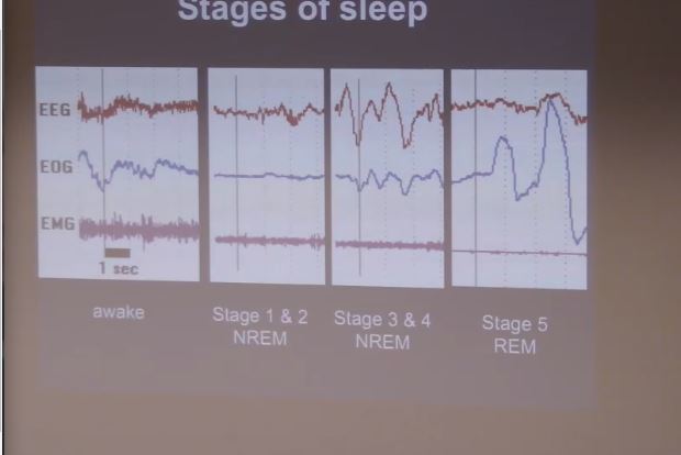 stage 1 and 2 is non rem, stage 3 and 4 also non rem, but stage 5 rem in 1 and 2, EOG low, IN 3 and 4, EOG getting more, until in REM, it’s a lot (much slower) (eyes are flickering) EEG in stage 5 similar to that when awake= further evidence that dreaming occurs in REM