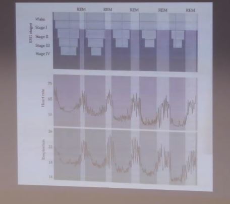 Sleep occurs in cycle, with the peaks of EEG at REM- at these points, there are also peaks in HR and breathing