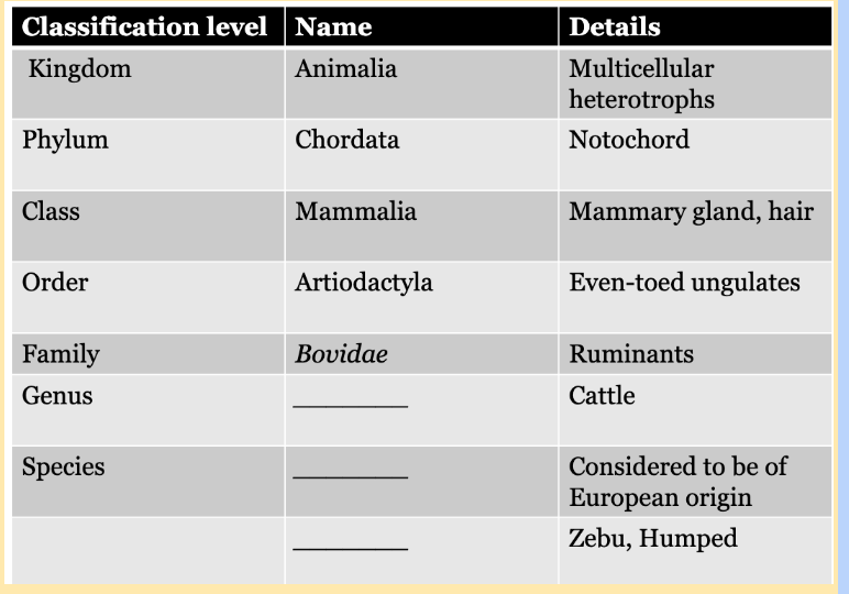Review Taxonomy Chart for Cow