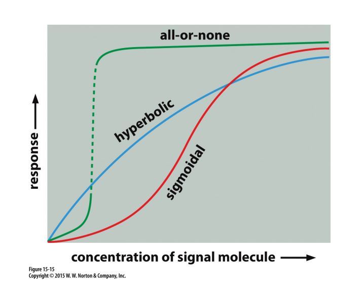 hyperbolic: response increases gradually as concentration of extracellular signal molecule increases (reaches a plateau)