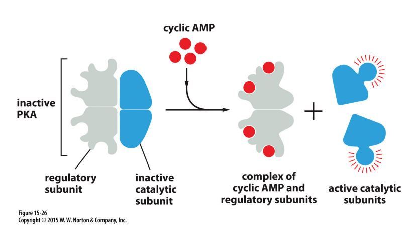 4 cAMPs lead to activation of PKA catalytic subunits