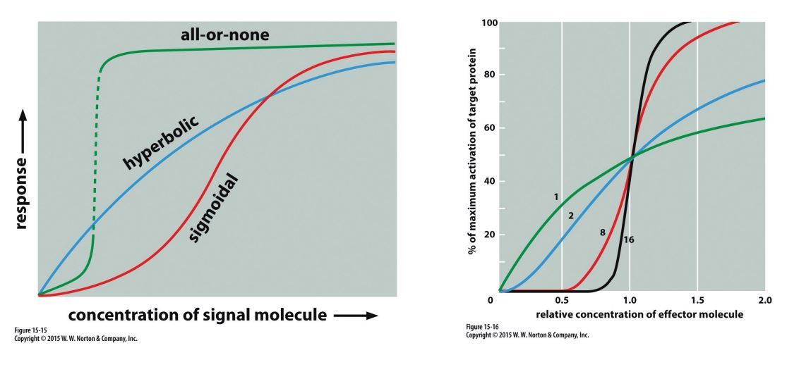 sigmoidal: signaling system reduces response at low signal conc and produces a steepr response at an intermediation conc