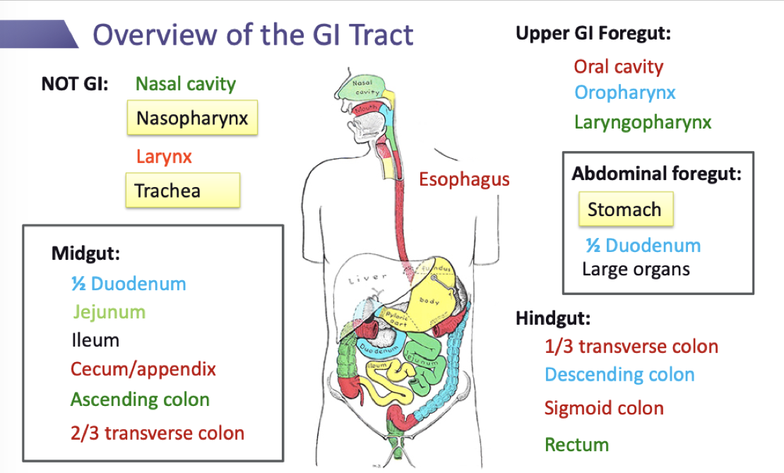 GI tract is divided into the abdominal foregut, midgut, and hindgut