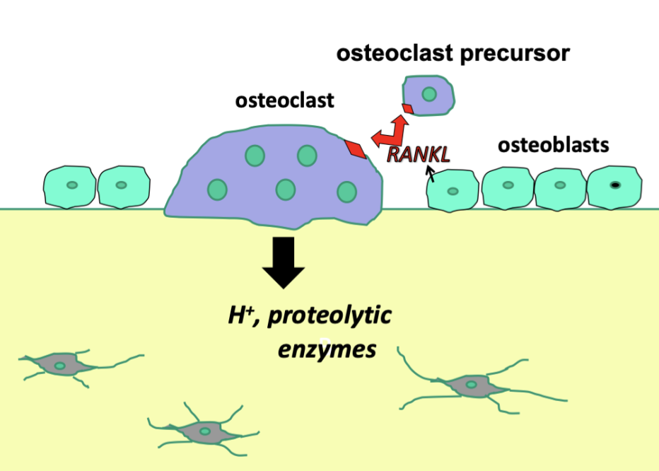 RANKL acts on the RANKL receptor on osteoclasts and osteoclast precursors