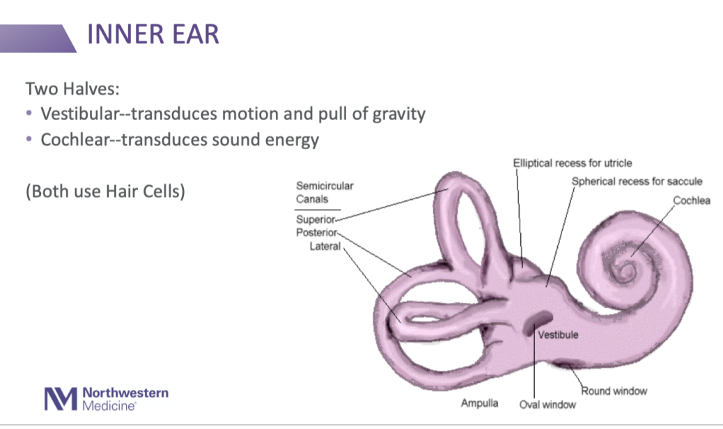 Inner ear is composed of vestibular and cochlear halves, both of which use hair cells