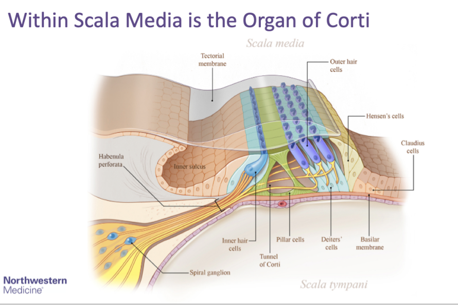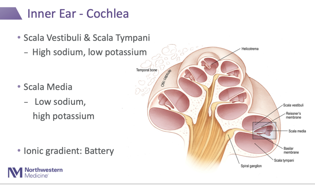 Scala vestibuli and scala tympani have high Na and low K, while the scala media has low Na and high K