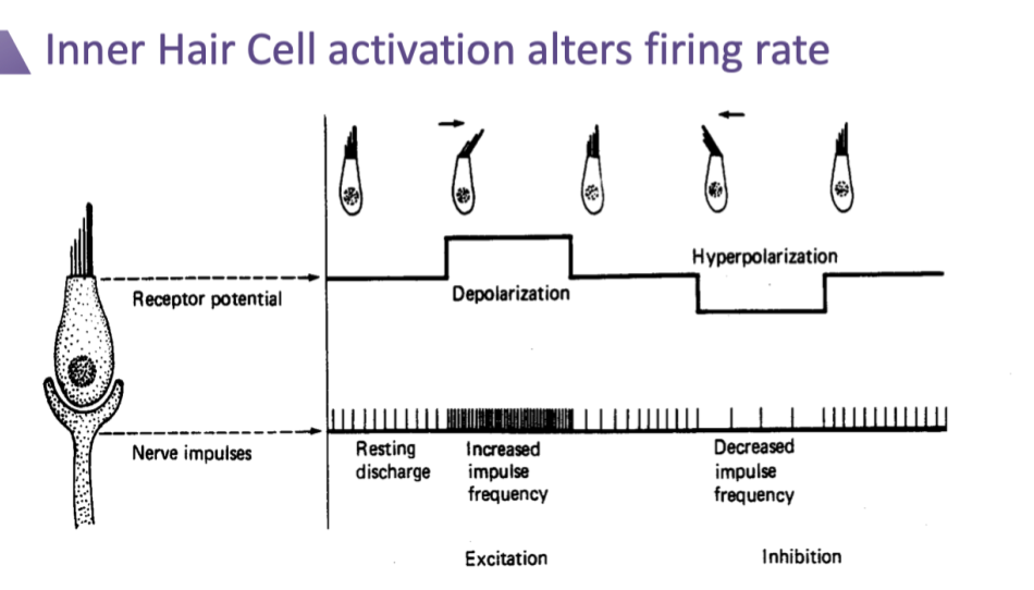 Head rotation causes a fluid shift in the semicircular canal, pushing against the cupula, causing the hair cells to depolarize