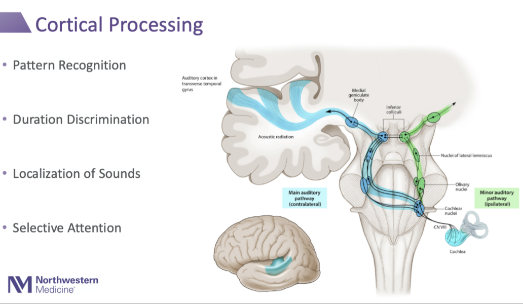 Cortical auditory processing functions in ____, ____, ____, and ____