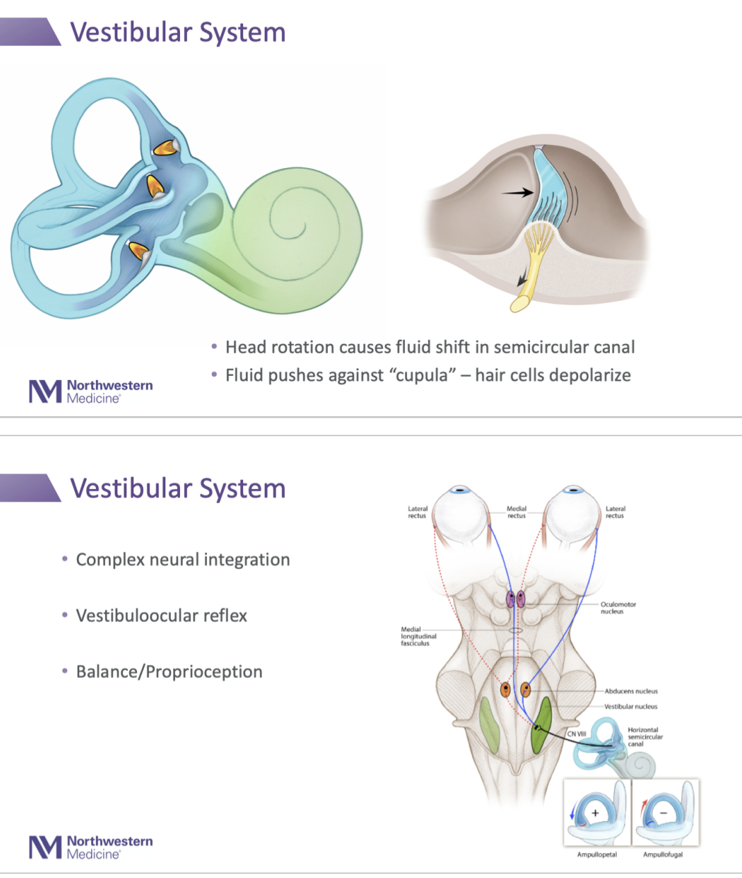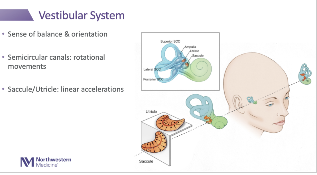 Semicircular canals are for rotational movements, while the saccule / utricle are for linear accelerations