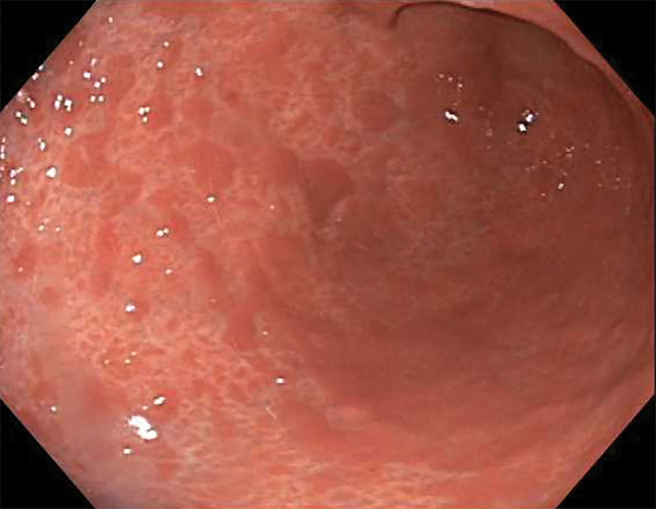 A 39-year-old woman presents with 6 years of epigastric abdominal pain and nausea. She was treated for an “ulcer” in the past, and then was diagnosed with functional dyspepsia on a clinical basis, but never had a GI-specific evaluation. She has rare non-bloody emesis, but no heartburn, dysphagia, diarrhea, hematochezia, or melena, although stool is sometimes loose. Over the last 6 months, she has lost approximately 5 lb because her appetite has been poor. She works in a pet store, has not travelled outside the U.S., and is on a municipal water supply. She has a cousin with Crohn’s disease, and her mother has rheumatoid arthritis.