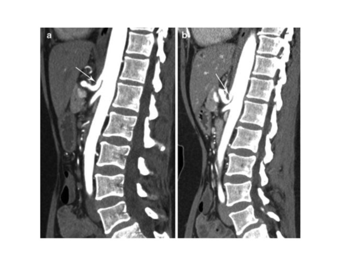 A 74-year-old man with a past medical history relevant for coronary artery disease (non-ST segment elevation myocardial infarction status-post stenting of his left anterior descending artery), paroxysmal atrial fibrillation, and peripheral vascular disease, presents with complaints of worsening supraumbilical pain. He has had this pain for 3 weeks, and he describes it as “dull and crampy” in character, with some posterior radiation. He notes that this pain is worse after meals, particularly those high in fat. He is eating minimally due to these symptoms and experienced weight loss of 5 lb during this time. He also reports loose stools and nonbloody diarrhea, as well as occasional nausea. His notable medications are apixaban, aspirin 81 mg a day, clopidogrel, and omeprazole 40 mg a day.
