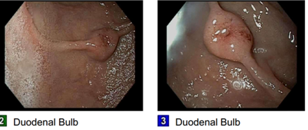 The EGD is notable for severe duodenitis with mucosal edema and exudates. The CT image reveals considerable small intestinal wall thickening consistent with enteritis. Whereas small intestinal infectious etiologies must be considered, it is important to recognize that capecitabine may cause severe enteritis. 5-fluorouracil, for which capecitabine is a prodrug, is known to cause enteritis. As this patient did not respond to proton pump inhibitor therapy with pantoprazole, it is not expected he would have significant response to esomeprazole. The diagnosis of metastatic pancreatic adenocarcinoma is established, and further imaging would not change management. Whereas baclofen may be utilized in centrally mediated hiccups, it would be more important to address the primary cause of the presentation.