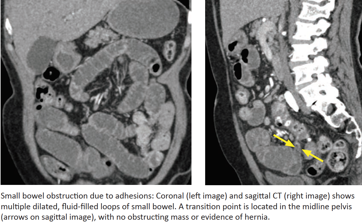 The vast majority of patients with SBO due to adhesions have had what in the past?
