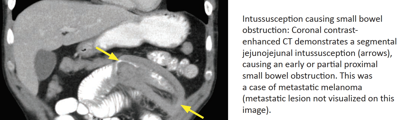 What are clues to detect the presence of a mass intrinsic to the small bowel?